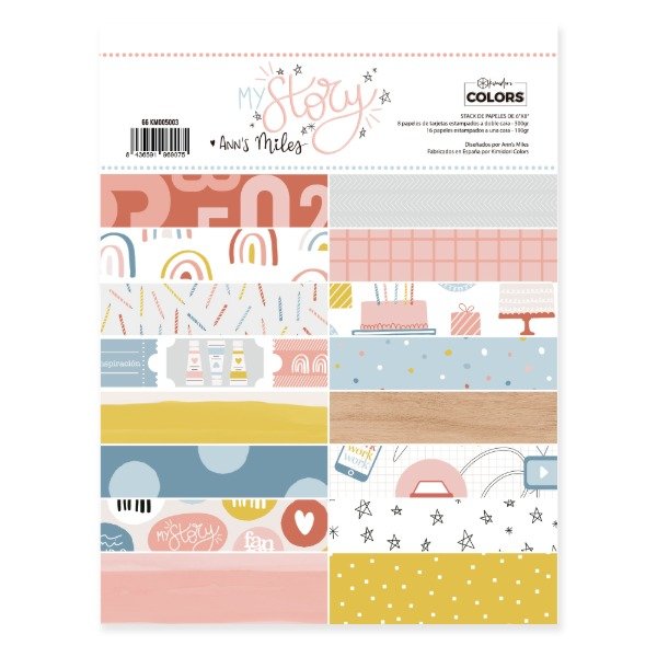 Blocs de papeles estampados. Tamaño: 6"x8" (15,2 cm x 20,3 cm). Cantidad: 15 papeles estampados a una cara + 8 papeles estampados a doble cara con tarjetas para recortar. Gramaje: 190 gramos